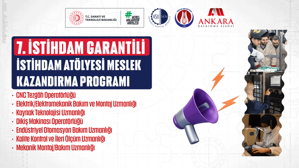 Ankara Kalkınma Ajansı, ASO Sürekli Eğitim Merkezi (ASO-SEM) ve Sincan Belediyesi iş birliğinde yürütülen İstihdam Garantili “İstihdam Atölyesi Meslek Kazandırma Programı” kadın istihdamı ağırlıklı olacak şekilde devam etmektedir. Kadın ve genç istihdamını artırmaya yönelik kadın başvuru sahiplerine öncelik sağlanacağı kursiyerlerin en az yarısının kadın kursiyerlerden oluşacağı 7. İstihdam Atölyesi Meslek Kazandırma Programına başvurular açılmıştır.